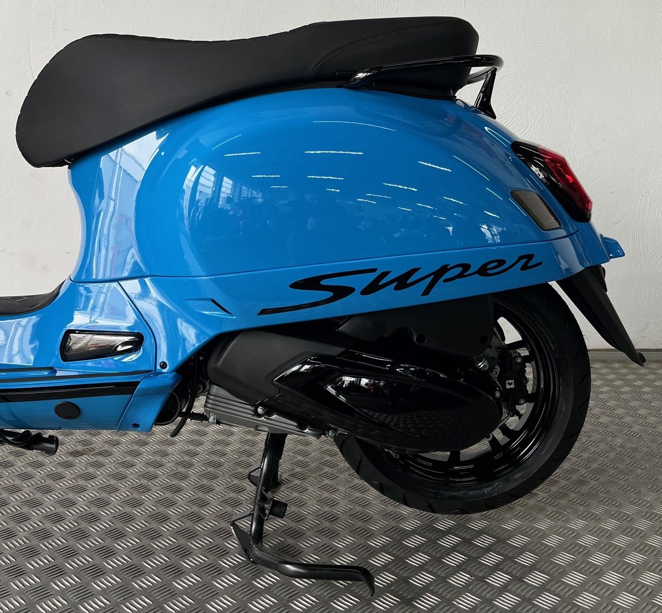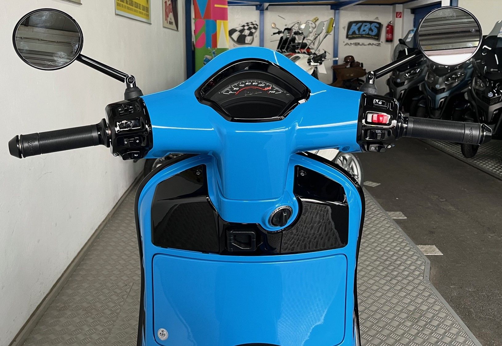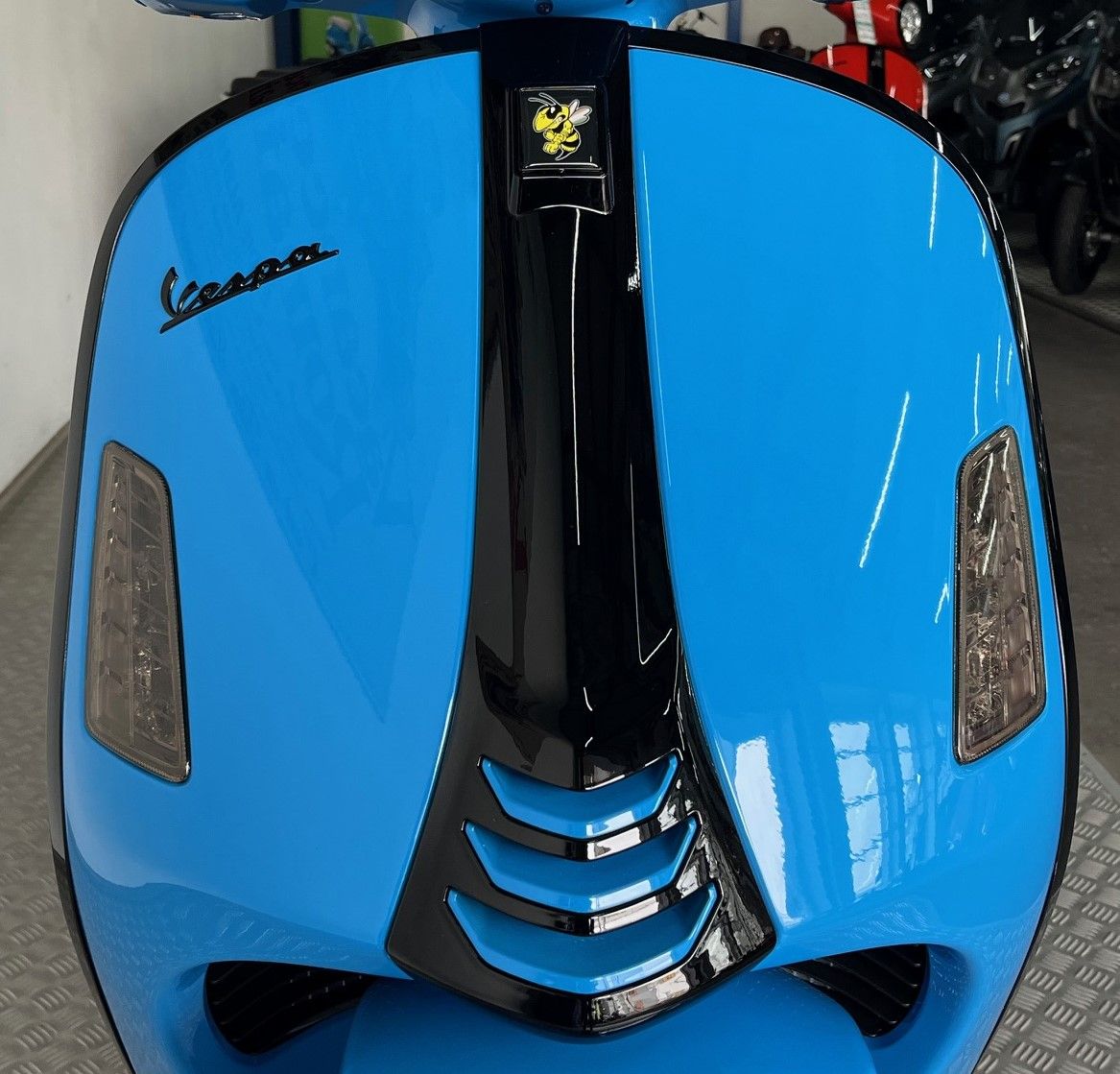 Bremshebel, Radkappe, Vorderrad-Schwingen-Abdeckung, Antriebsdeckel, Schriftzüge, Schaltereinheiten in glänzend schwarz, Krawatte, Lufteinlass an der Krawatte in blau, Wartungsklappen oben am Beinschild, schwarzes Piaggio Emblem, Lenkerenden-Spiegel, dunkel folierte Blinker,