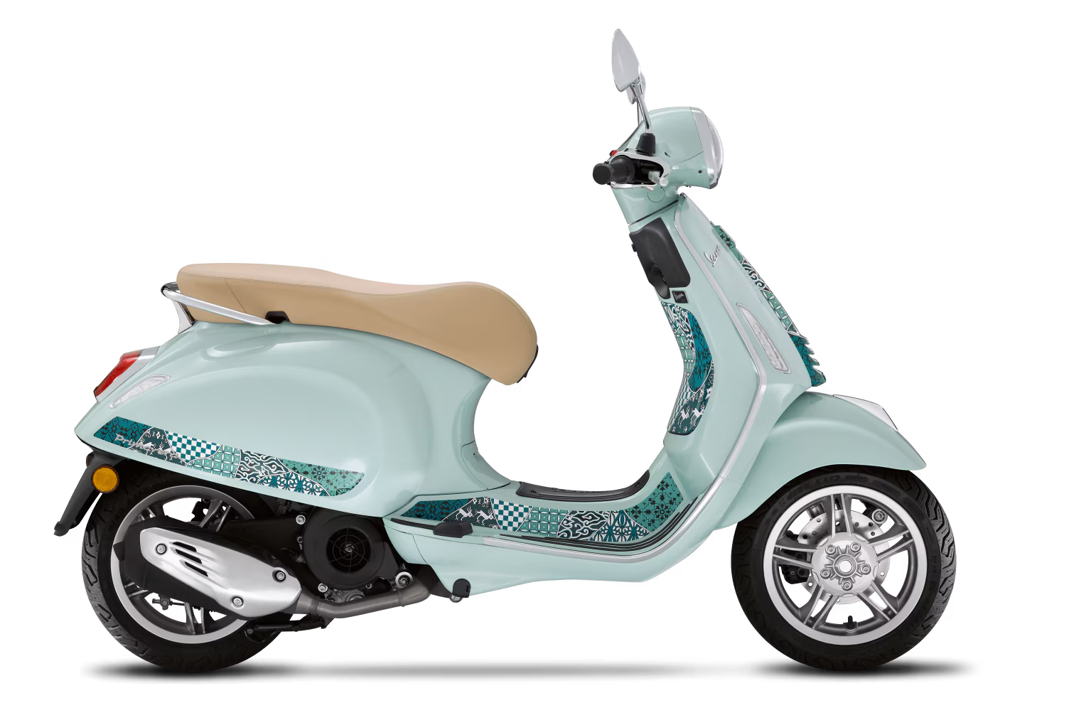 Die Vespa Primavera Batik zelebriert die Verschmelzung der eleganten Linien des italienischen Designs mit der alten Kunst des Batik. Die Grundfarbe Grün Amabile wird mit einem Tambal Jagad-Muster kombiniert, das aus sieben verschiedenen Motiven besteht, von denen jedes eine Insel des indonesischen Archipels repräsentiert und verschiedene Tugenden symbolisiert. Das Ergebnis ist ein Eintauchen in die türkisfarbenen und weißen Töne eines tropischen Strandes, mit gewundenen Linien, die Wellen darstellen, für eines der eindrucksvollsten Modelle, die jemals in der langen und fesselnden Geschichte von Vespa herausgebracht wurden.