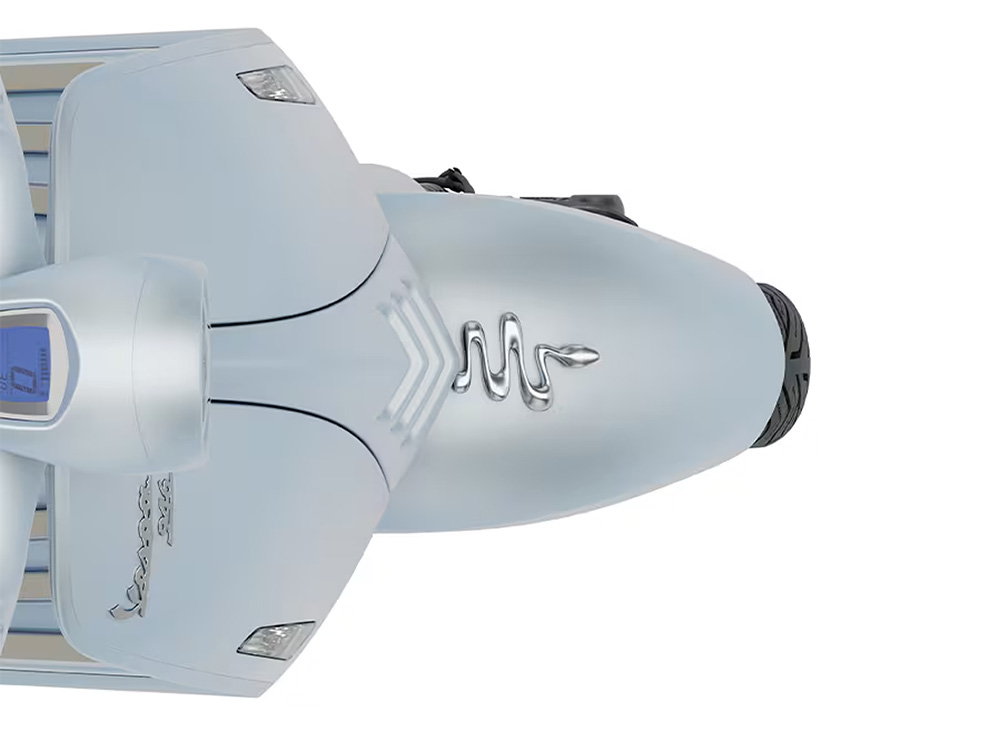 Jeder neue Weg ist eine Entdeckung, jede Pause ein Moment der Erneuerung. Auch der Tankdeckel der Vespa 946 Snake trägt die Chromgrafik dieses Wesens, das für Veränderung und Wiedergeburt steht.