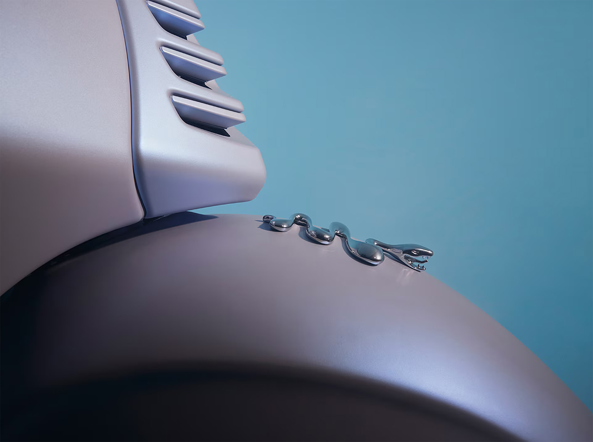 Der vordere Fender ist mit einer verchromten 3D-Grafik in Form einer Schlange verziert: ein Symbol für Geschmeidigkeit und Eleganz, das jeder Kurve bis zum Horizont folgt.